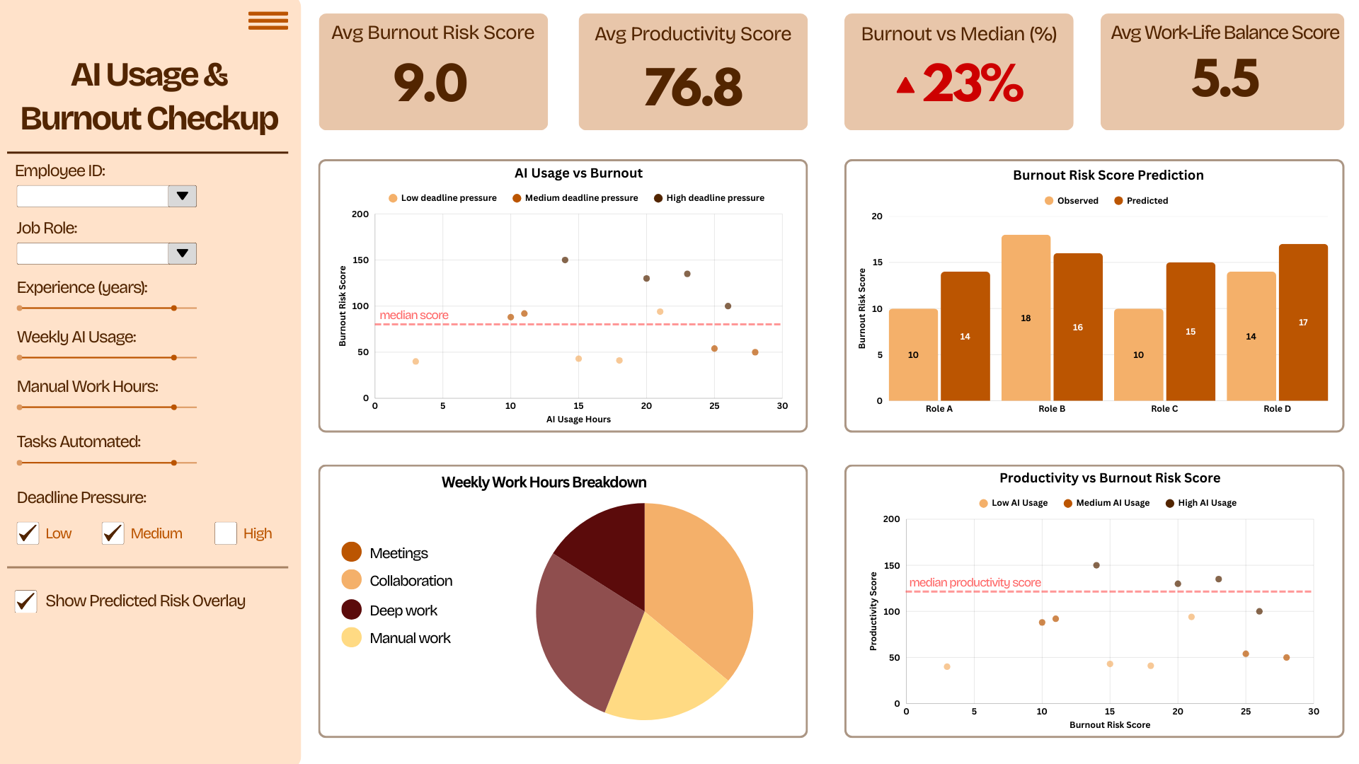Burnout Checkup is an interactive dashboard designed to explore the relationship between AI tool usage, workload characteristics, and employee burnout risk.