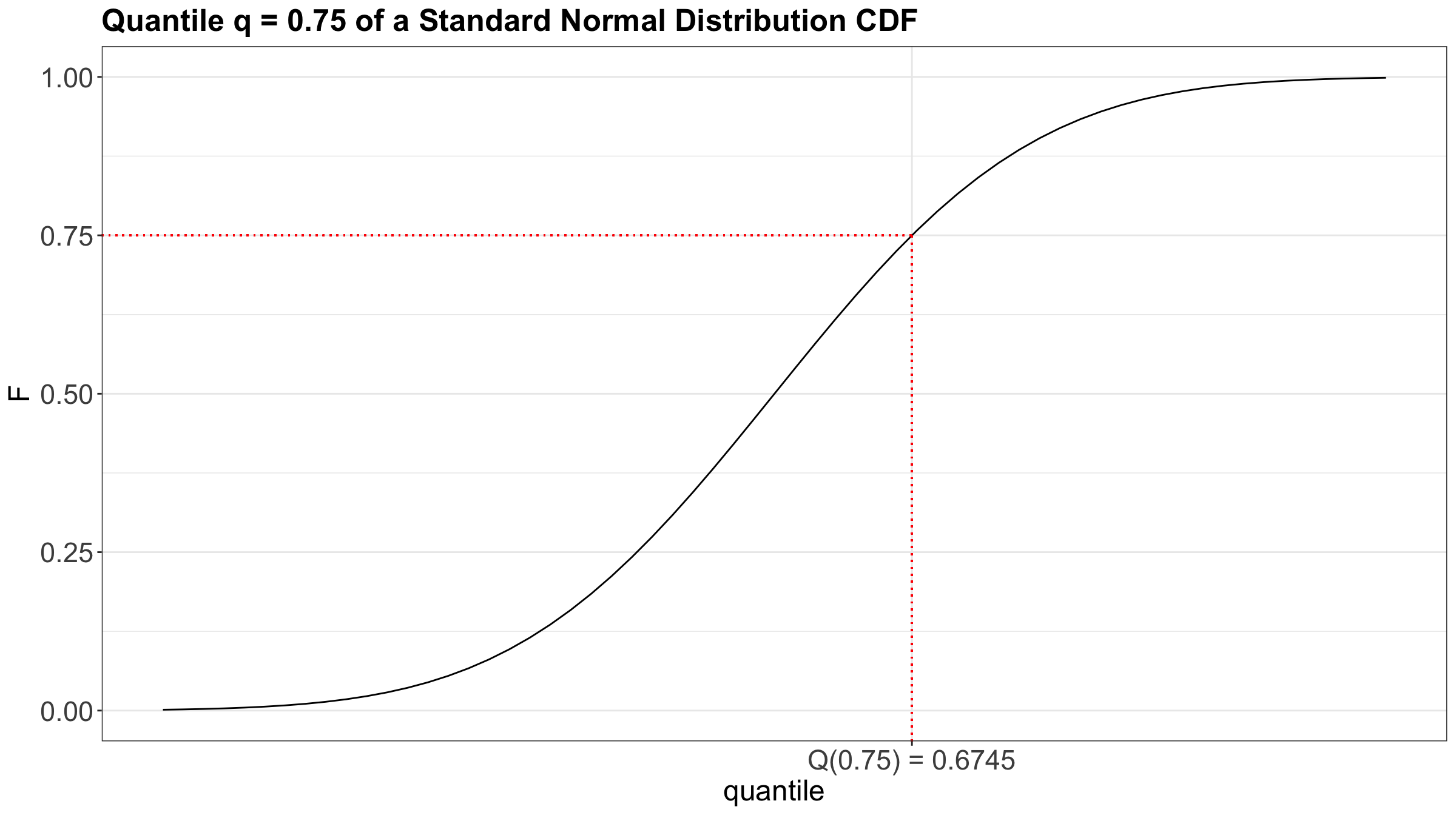 Moreover, Figure 3 also shows the 0.75-quantile for the Standard Normal distribution using the CDF where the cumulative probabilities are on the \(y\)-axis.