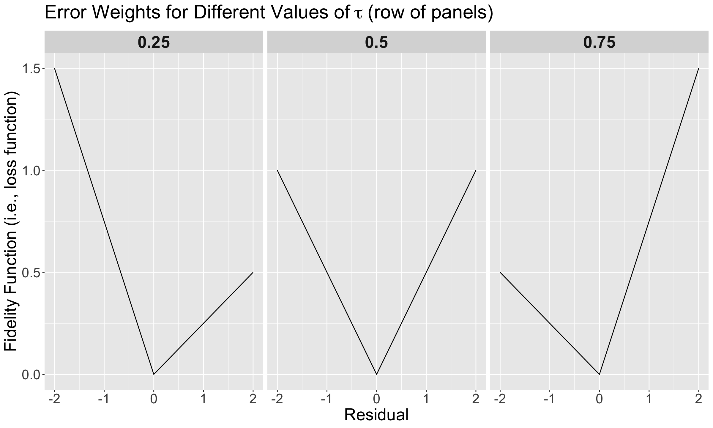 In Equation 1, \(\beta_j(\tau)\) (for \(j = 0, 1, 2, \dots, k\)) means that the regression term depends on the quantile \(\tau\), which is the desired quantile. In other words, for each quantile, we (might if our inquiry dictates so!) have a different regression function on the right-hand side of our modelling equation.