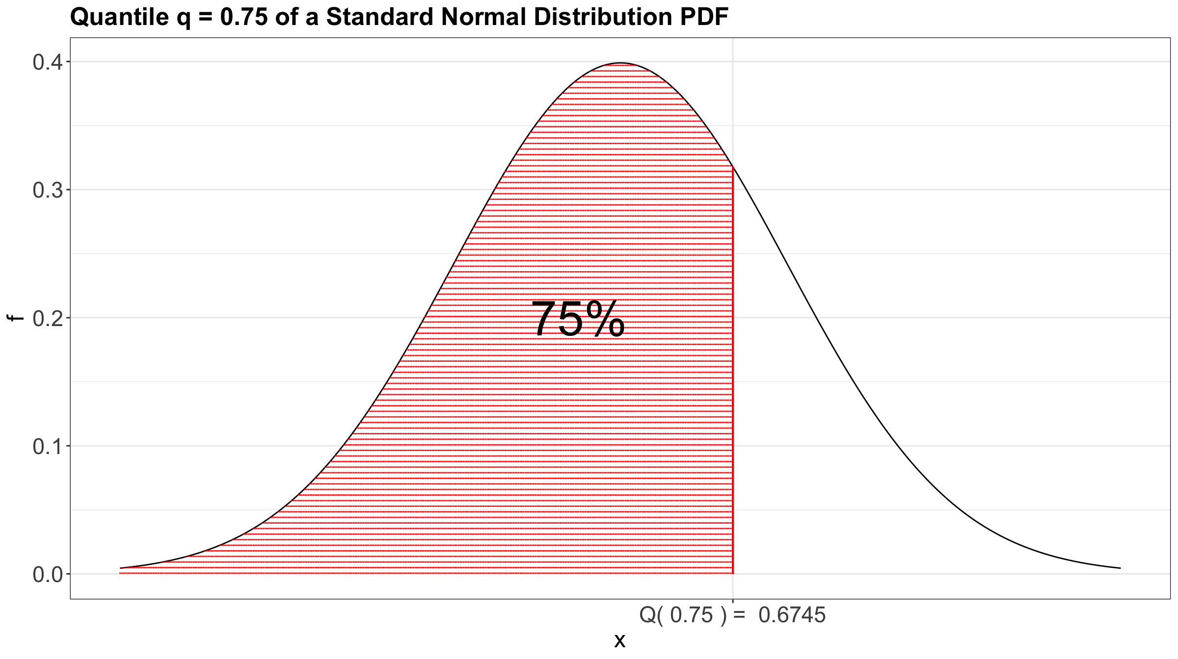 As an example, we can check the case of the 0.75-quantile for the Standard Normal distribution using its probability density function (PDF) in Figure 2.