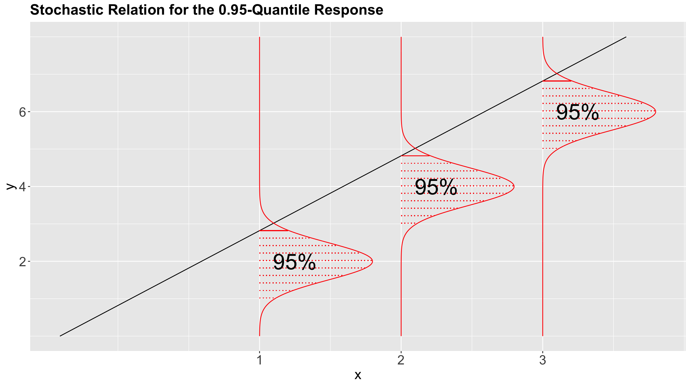 This whole conditional distribution allows us to regress our response with more than just the mean, such as the median or any other quantiles! Figure 5 shows the stochastic nature of the conditional distribution for the \(0.95\)-quantile.