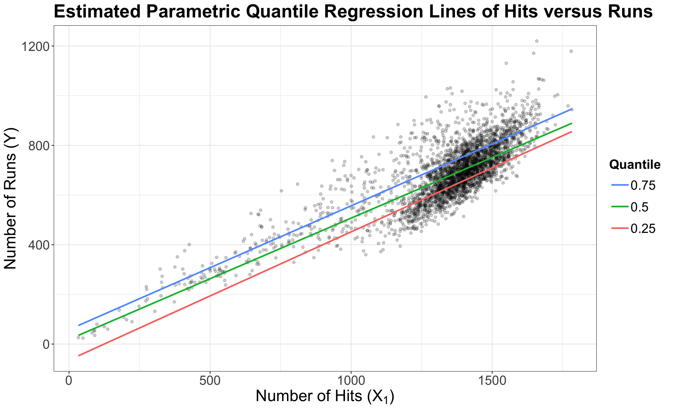 In a more practical setting, suppose you use the teams dataset to fit a Quantile regression of runs (\(Y\)) versus hits (\(X_1\)) on the response’s quantile \(\tau = 0.75\). Then, your regression equation for the \(i\)th observation becomes: