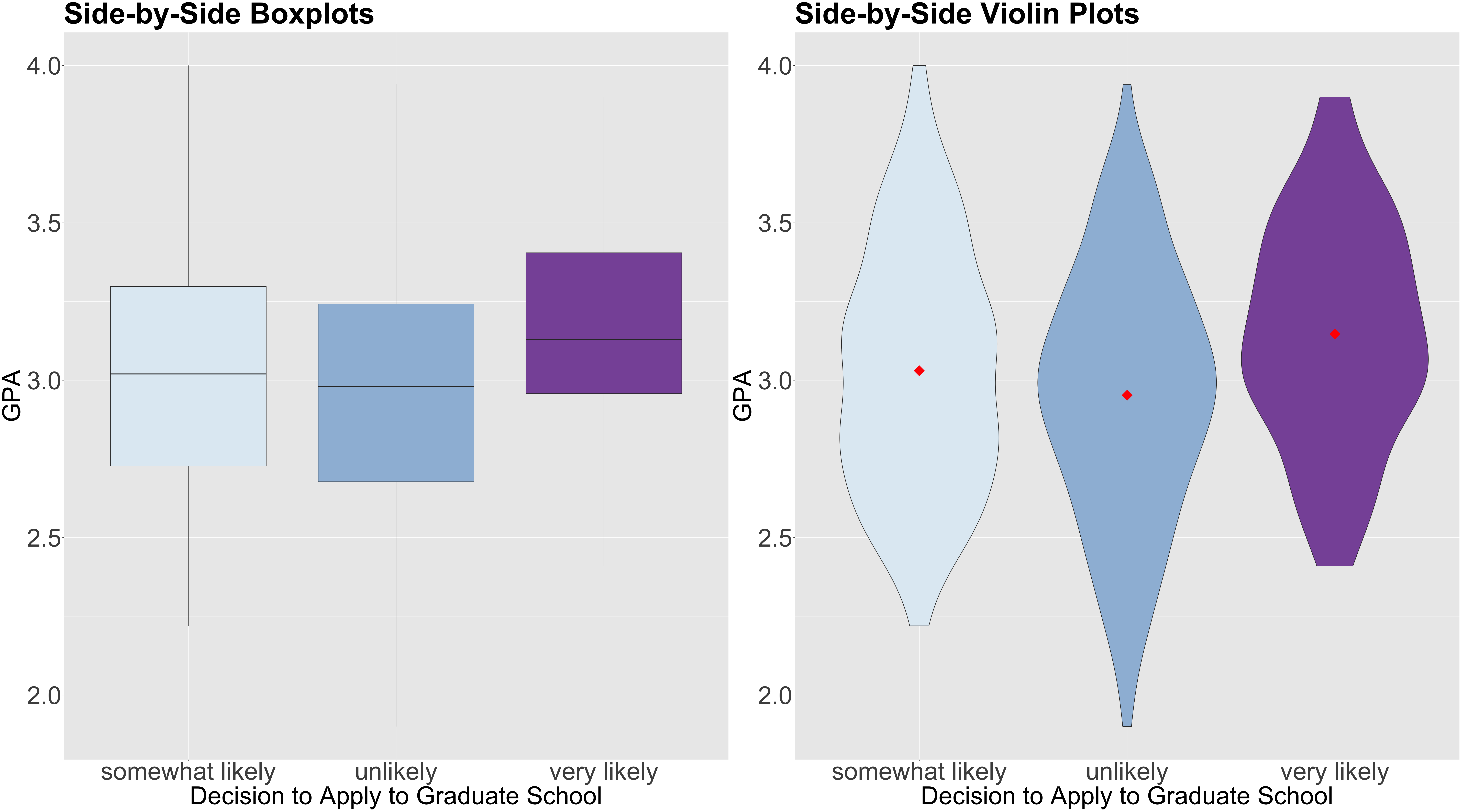 college_data was obtained from the webpage of the UCLA Statistical Consulting Group.Rdecision: how likely the student will apply to graduate school, a discrete and ordinal response with three increasing categories (unlikely, somewhat likely, and very likely).parent_ed: whether at least one parent has a graduate degree, a discrete and binary explanatory variable (Yes and No).GPA: the student’s current GPA, a continuous explanatory variable.decision will be our response of interest.as.ordered().decision statistically related to parent_ed and GPA?decision is a discrete ordinal response, we have to be careful about the plots to be used in the EDA.decision and GPA , we will use these side-by-side plots: boxplots and/or violin plots.GPA is on the \(y\)-axis, and all categories of decision are on the \(x\)-axis.GPA by decision category in red points.decision and parent_ed?decision with the categories found in parent_ed on the \(x\)-axis.