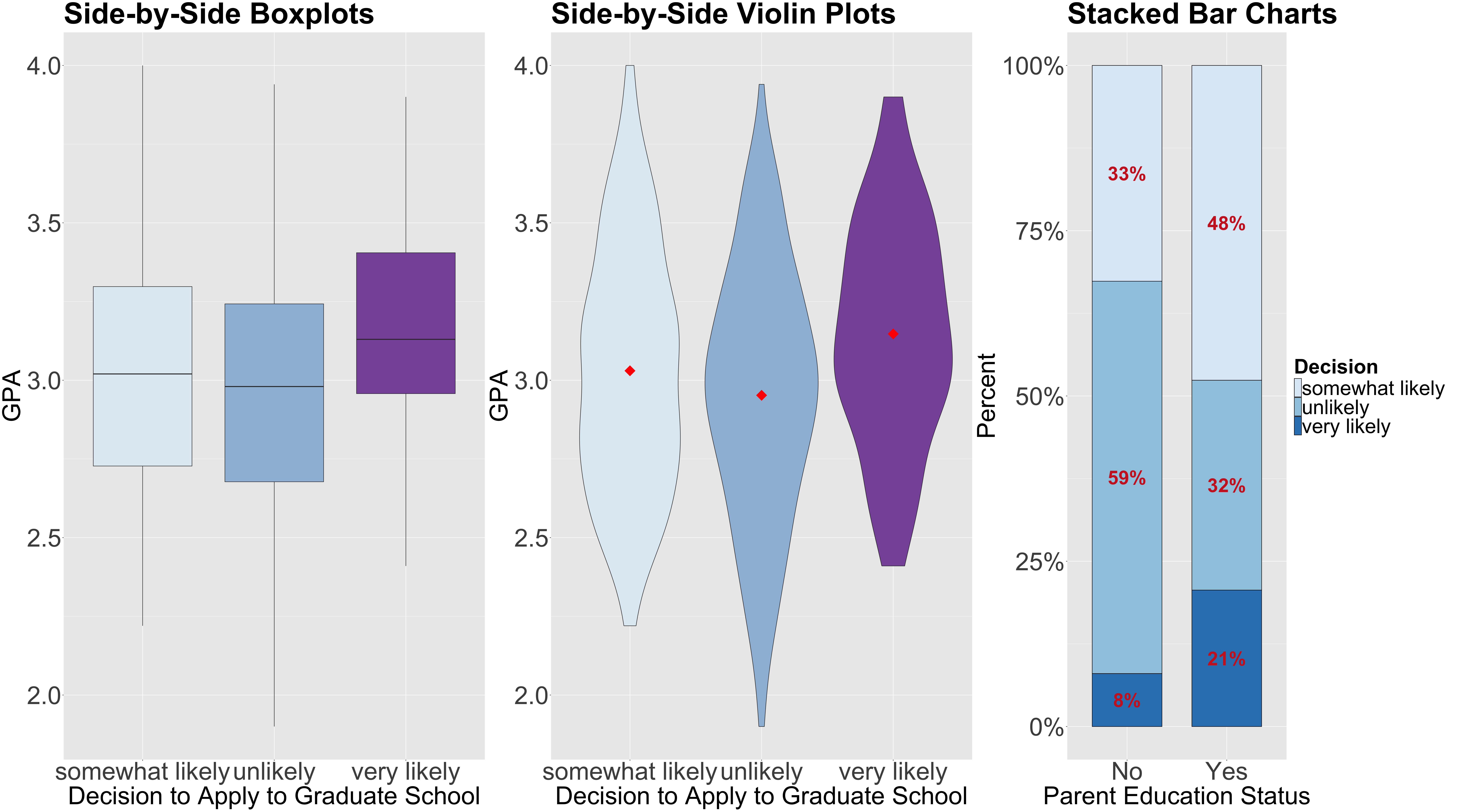 decisionstatistically related toparent_edandGPA? - How can we interpret these statistical relationships (if there are any!)?