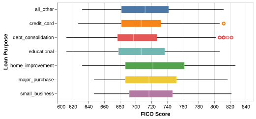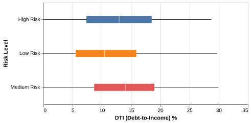 From Figure 4, we see that the low-risk borrowers have a lower average debt-to-income ratio as compared to the borrowers with medium and high-risk profiles, based on their fico score. Note also the outliers in FICO scores for the loan purpose of debt consolidation type.