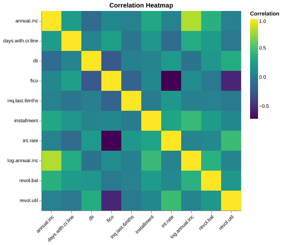 The EDA for most of the numerical columns produces no strong general trends. We see a higher correlation level between fico and revo.util, and that of fico and interest rate. (Figure 6)