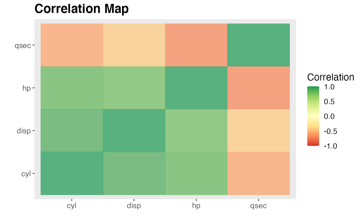 corr_map( data, features, corr_method = "pearson", color_scheme = "RdYlGn", title = "Correlation Map" )