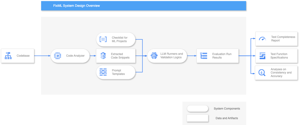 Our approach includes developing the tool called FixML, a Python package based on large language models (LLMs), and creating comprehensive checklists to enhance ML software’s trustworthiness, quality, and reproducibility. The tool analyzes ML projects, compares test suites against best practices, and delivers evaluations and test specifications. This functionality can significantly reduce the time and effort required for manual assessments.