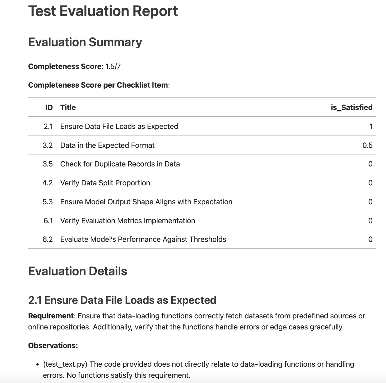 Our approach will provide scalable and reliable test suite evaluations for multiple ML projects. However, due to time constraints, we recognize that our current best practices only focus on a few high-priority test areas. We plan to expand this scope in the future. While our tool’s evaluations are less reliable than human evaluations, we will quantify its performance.