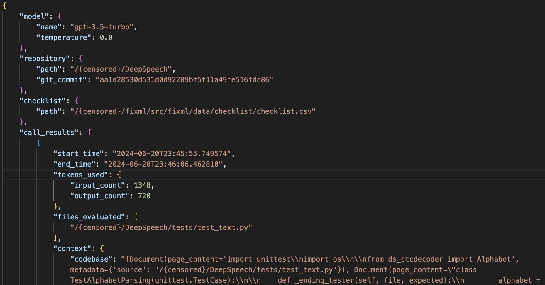 Figure 3: An example of the evaluation responses, which includes call_results for evaluation outcomes and details about the model, repository, checklist, and the run.