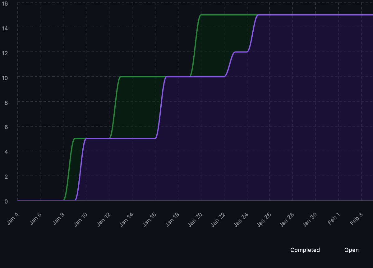 Analysis: The burn-up chart reflects the “backend-heavy” nature of our workflow. The early milestones show a steady but slow completion rate. The sharp rise in the final milestone corresponds to the aggregation of peer feedback and the resolution of the “last mile” tasks—specifically the integration of unit tests and repository badges which were critical for the final release.