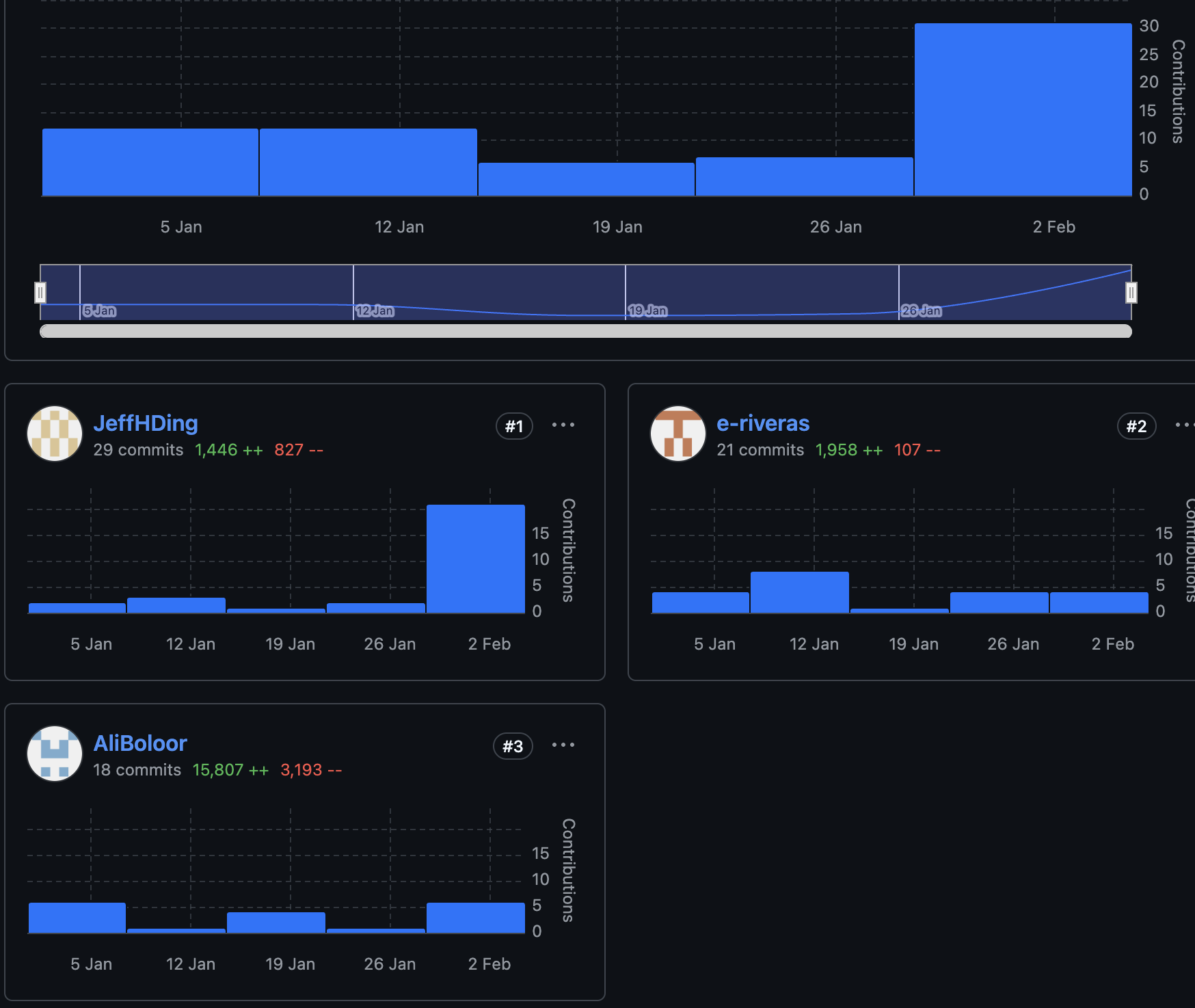 While work was dispersed to allow members to code features independently, we aimed for an equitable distribution. The independent nature of the work, however, did lead to some integration challenges (detailed below) which required collective effort to resolve. There were varying commit counts among team member; however, this is due to varying task complexity. All members contributed significantly to the final product. Teammates all collaborated effectively to resolve outstanding github issues. —