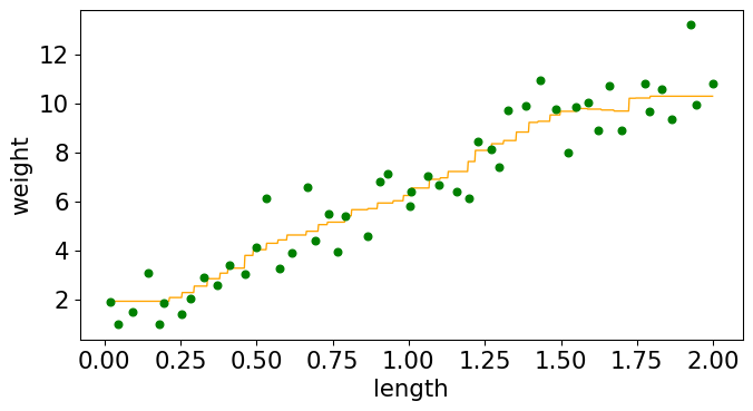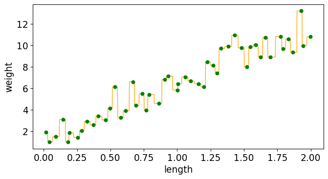 from sklearn.neighbors import KNeighborsRegressor knnr = KNeighborsRegressor(n_neighbors=1, weights="uniform") knnr.fit(X_train,y_train);
