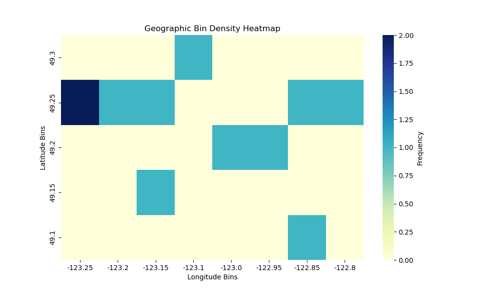 lat_long_distance: calculates the distance (in kilometres) between two geographic points given their latitude and longitude coordinates.lat_long_binning: bins latitude and longitude into different groups to aid in grouping or for use inplot_binned_lat_long.plot_binned_lat_long: visualizes binned geographic coordinates on a heatmap.