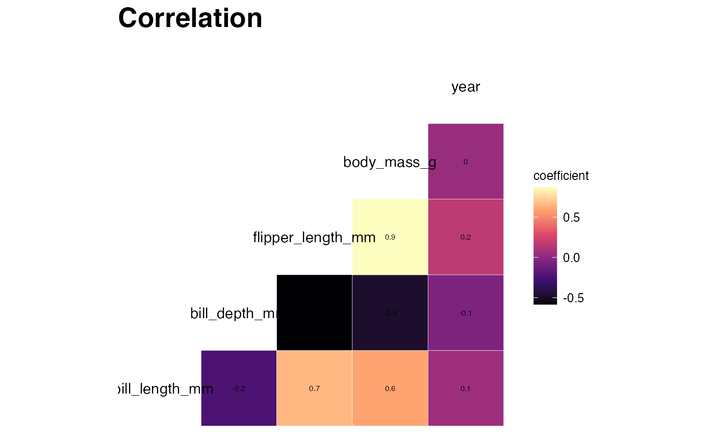 corrplot(penguins_data, print_corr = TRUE, title = "Correlation")