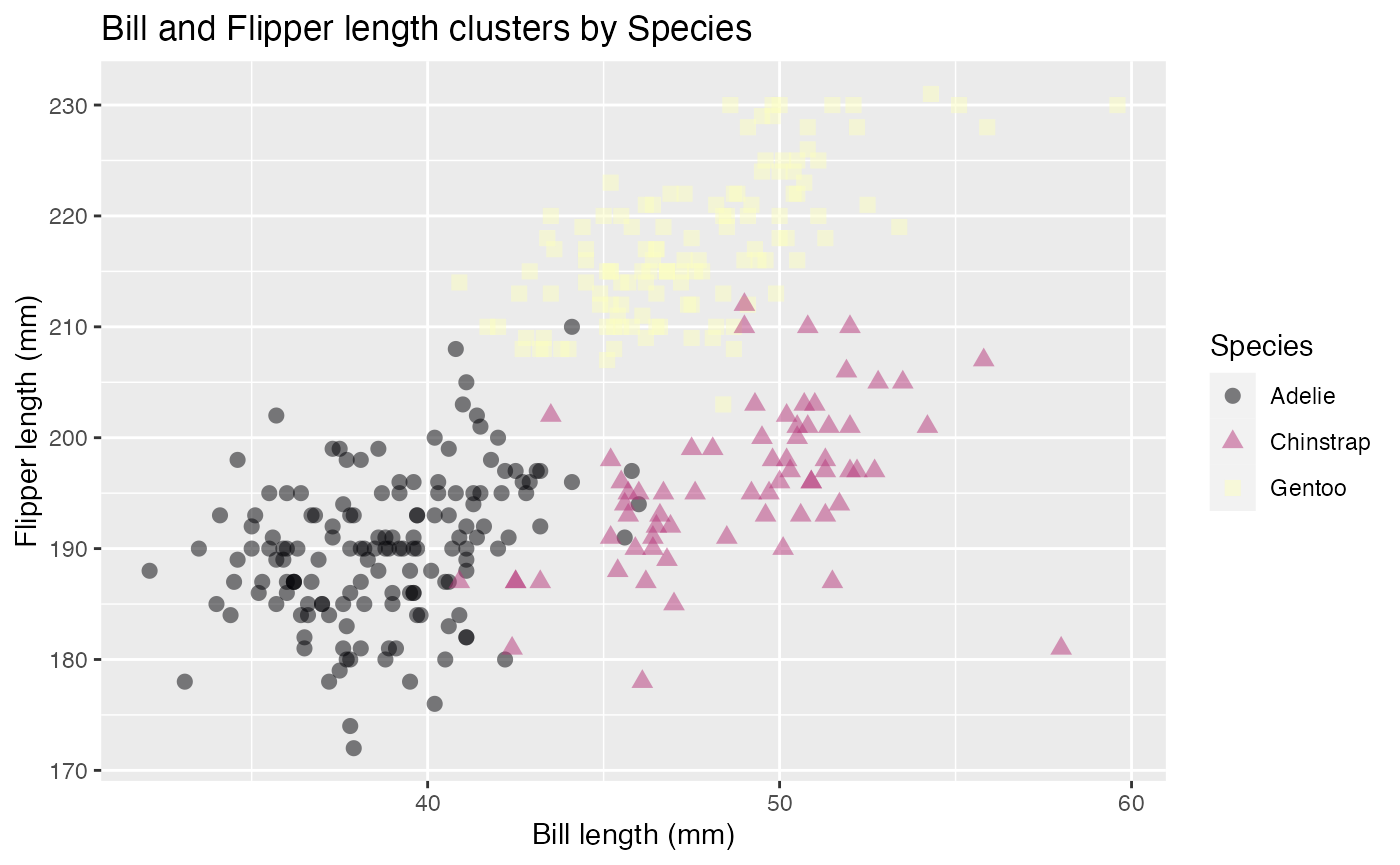 scatterplot(penguins_data, bill_length_mm, flipper_length_mm, species, "Bill and Flipper length clusters by Species", 0.5, 2.5, "Bill length (mm)", "Flipper length (mm)", "", FALSE, FALSE, TRUE)
