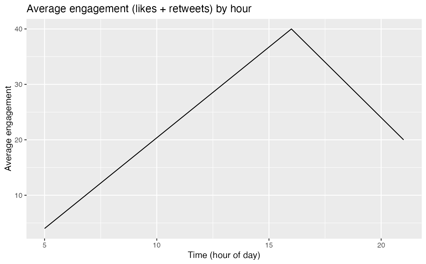 my_tweets <- data.frame (created_at = c("2021-03-06 16:03:31", "2021-03-05 21:57:47", '2021-03-05 05:50:50'), favorite_count = c(20, 10, 2), retweet_count = c(20, 10, 2)) engagement_by_hour(my_tweets)