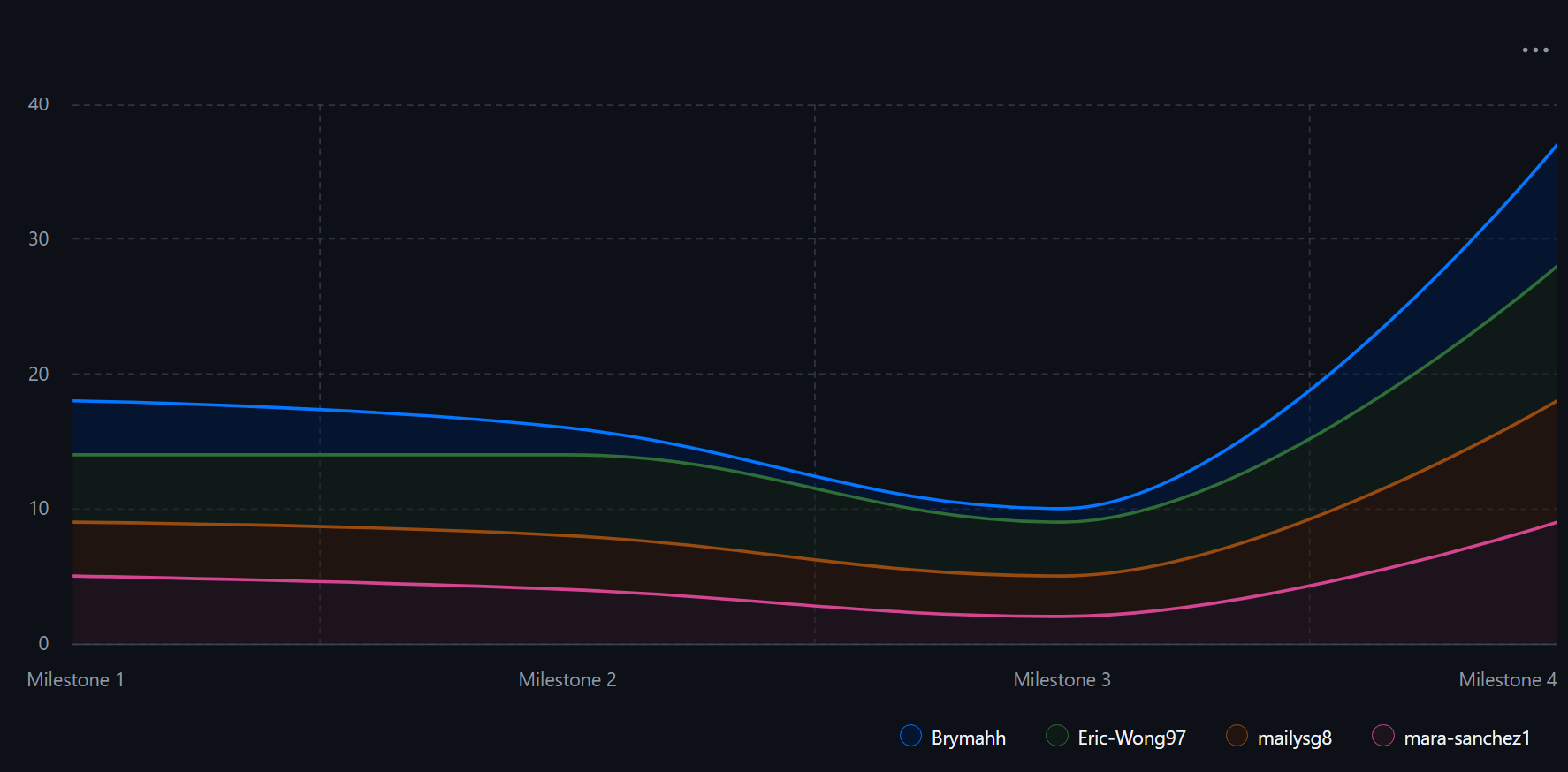 The significant increase in completed work during Milestone 4 was largely driven by the need to address peer review feedback and finalize all remaining project components. Incorporating peer suggestions required revisiting earlier design, code, and documentation decisions, which led to additional revisions and new tasks being completed within this milestone. At the same time, Milestone 4 represented the final delivery phase, where unfinished items from previous milestones were resolved, polished, and consolidated. Together, these factors resulted in a noticeable spike in completed work compared to earlier milestones.