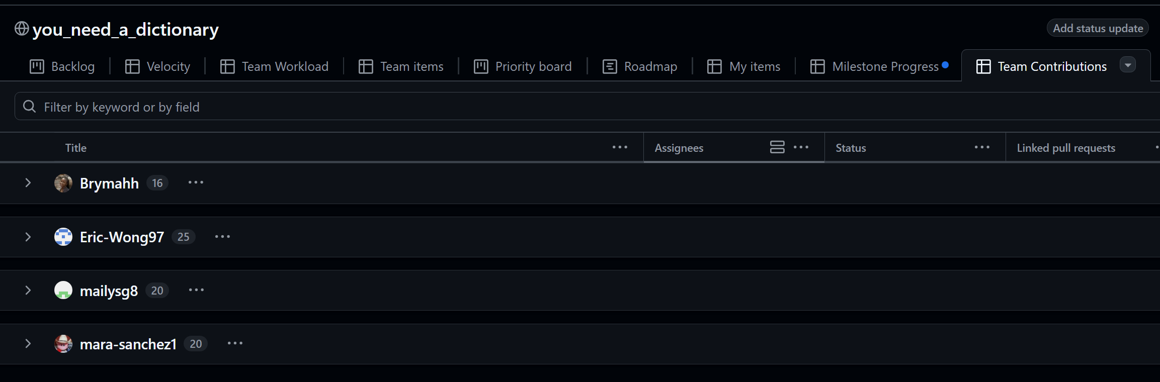 We created several tables and views in order to better analyze our project’s metrics and how each member contributed.
